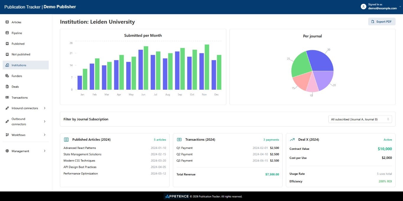 We have developed an easy to use tool called the Publication Tracker. It provides a flexible (meta)data store that captures “events” from different systems like your editorial system, production and content distribution systems, as well as any financial or payment systems.